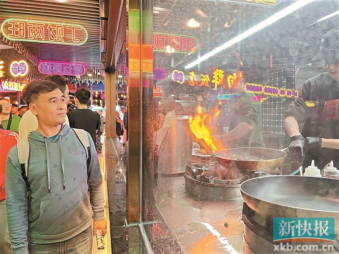 这一边,一只只肥肥白白的大鹅在烤箱里滋溜溜地冒烟,转身出来就是一副红彤彤油亮亮的模样,引得在炉外观赏的街坊们连连拍照记录;那一边,一位位后生厨师手持大锅,不断翻滚手中的青椒黄鳝,层层火焰从燃气灶上扑腾而起,贴着玻璃围观的街坊们不由得“哇”声一片……在宝悦坊连通南北两侧的公共走廊上,食肆商家把明档炒菜、明炉烧烤等原本隐匿于后厨的烹饪细节搬至台前,使食客不仅能品尝美食,更能直观感受食物制作过程中的“烟火升腾”。