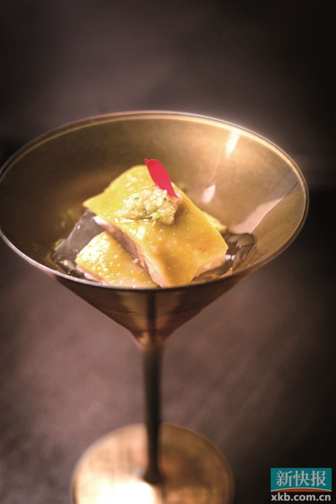 一道白切鸡,多少广州人从小吃到大?作为粤菜中最首当其冲的招牌以及经典中的经典,如何在传统基础上推陈出新?既让食客吃到熟悉的味道又能感觉眼前一亮?为此,邢辉运用了“冰浴”方式烹制那只鸡龄在180天到200天的清远鸡,除了冰浴,还加入白卤水以让鸡肉入味,并将胶原蛋白凝固后形成的啫喱单拎出来,与鸡肉一同盛放在马天尼杯当中,佐以些许姜葱茸上桌,瞬间让这只鸡的“灵魂”得到了升华……