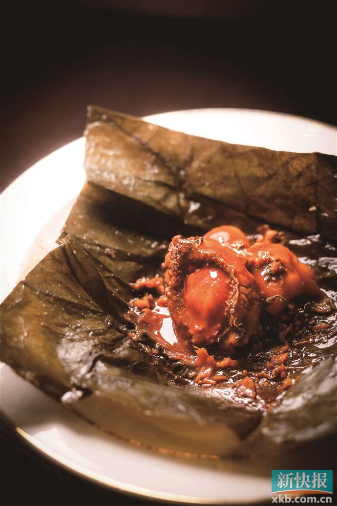 客家菜是粤菜三大分支之一,梅菜扣肉和客家盐焗都是食客非常熟悉的招牌,而在邢辉手中,梅菜扣肉与盐焗猪手来了个“乾坤大挪移”,扣肉换成猪手,同时加入鲍鱼中和口感,这还不算完,用荷叶将它们包裹起来以细盐加以焗烤,上桌前再在食客面前拆开,仪式感和厨师心意双双拉满,完成了梅菜猪手扣鲍鱼的“盐焗”篇。