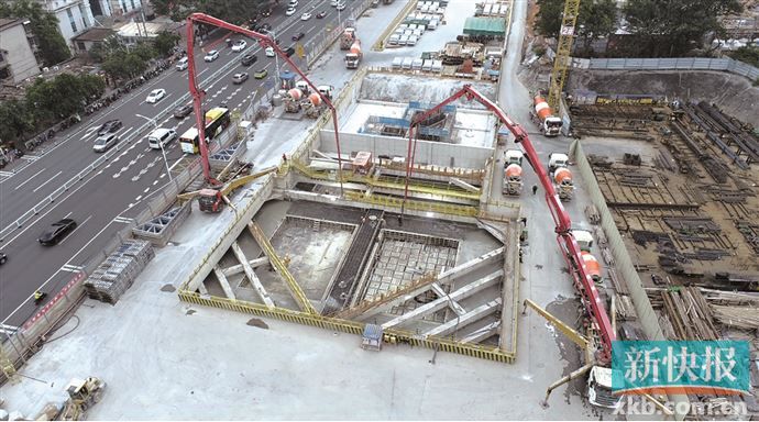 此外,“羊城号”盾构机也完成了方石站至白方盾构井区间施工任务,宣告线路最大直径盾构隧道顺利贯通。截至目前,广花城际铁路土建工程累计完成59%。7座车站已全部封顶;7个区间全部进行土建施工,共21台盾构机正在掘进。图为京溪路站封顶混凝土浇筑。