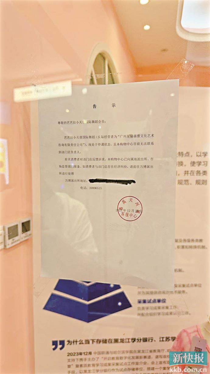 2025年12月24日,于女士等多名家长带孩子到门店上课遭老师拒课,“老师也在,但没有上课,说是联系不到老板和老板娘,没有给他们发工资,有的老师说医保、社保已经断缴了五六个月。”刘女士则是当天下午看到机构老师的朋友圈才知道门店出现问题:“校区全是人,找不到老板,老师工资没发,没人上课,家长报警了。”当日,番禺天河城物业锁闭校区并张贴告知书,校区正式关停。