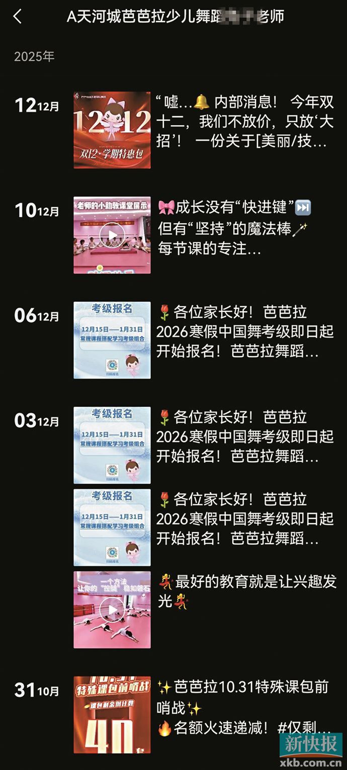 于女士的女儿自2岁5个月起便在芭芭拉小天使国际舞蹈番禺天河城校区学习,至校区关停已持续三年半。她坦言,选择该机构的核心原因是信任其“全职师资”宣传及大型商场的招商背书。家长们的缴费记录显示,单次续费多在1万元左右,常规课程单价130-140元/90分钟,私教课费用高达300-400元一节,部分家长累计缴费超3万元。