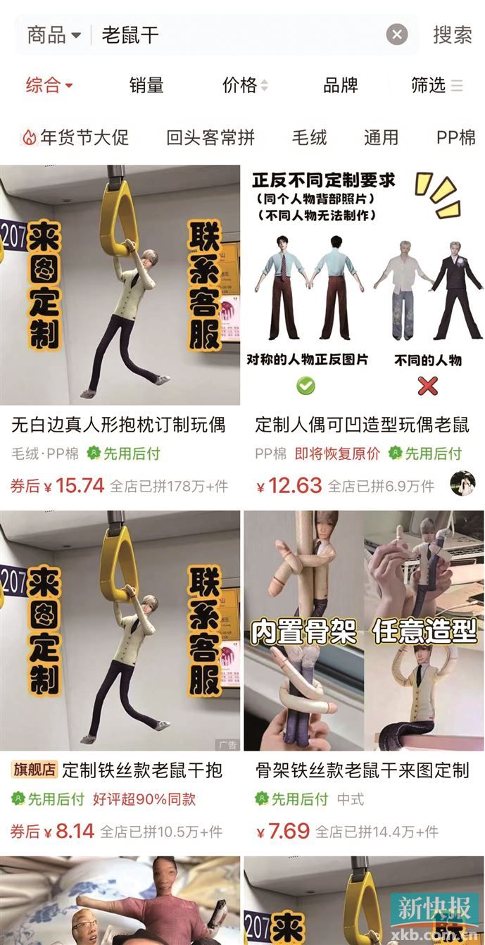 来自佛山的虾虾,最近一条朋友圈收获了许多点赞。合照里,一只印着好友照片、约30厘米长的“老鼠干”赫然在列。“原本是宿舍聚会,但一个姐妹临时来不了。有人提议‘给她做个分身替她出席’,大家全票通过。”从提交照片到收货,仅三天,花费16.9元。虾虾觉得,比起以往在合照里P上头像,实体“替身”让缺席者“参与感”更强了。