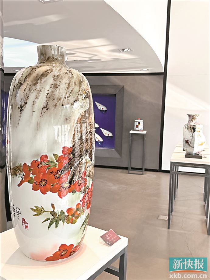 关兰突破传统瓷绘边界,将隔山画派标志性的兼工带写技法与瓷釉特性精妙融合,独创色釉局部堆积与塑形工艺,更吸纳西方设计理念,淬炼出典雅富丽、辨识度极高的艺术语言。此次广州展的展品,集中呈现了关兰熔古铸今的艺术巧思。在题材表达上,岭南风物成为核心线索,木棉的炽烈、簕杜鹃的烂漫、紫荆花的雅致、荔枝的嫣红等家乡意象跃然瓷上。值得一提的是展览中唯一一件“青花邂逅蒙德里安”作品,以传统青花的雅致笔触对话西方构成主义的几何美学,红黄蓝原色与青花钴蓝碰撞,直线分割与飞羽花卉交织,实现了跨时空的艺术碰撞。