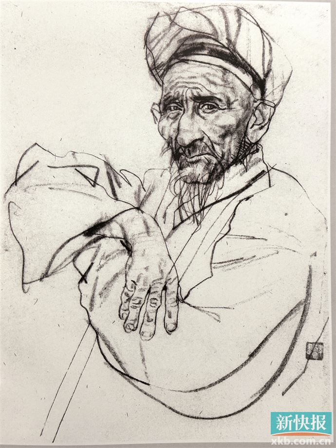 然后一个老太太穿着大棉袄,是揣着手“砰”的一下就从碾子上跳下来了,小脚落地,这个连贯动作特别生动!鲜活极了!她是甩着小脚扭搭扭搭地跑到我这儿来看我画。