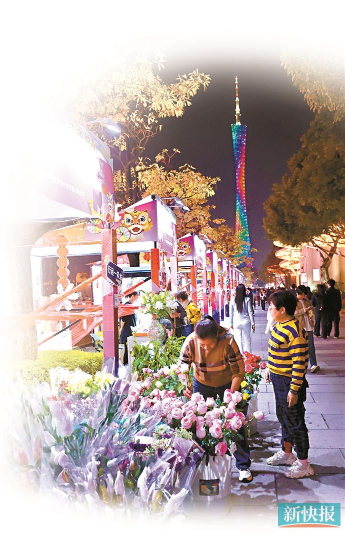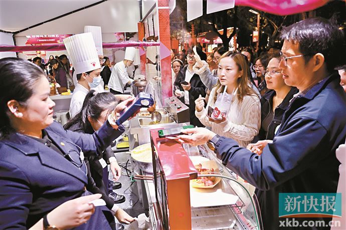 “这是我们广府贺年经典食品‘笑口枣’,香喷喷,寓意新的一年开心常驻,快来尝尝吧。”一个售卖广式盆菜、贺年食品的摊位前,店主米高热情地向来往游客介绍。在通草画摊位,非遗传承人展示了通草画《马上来财》,吸引了很多游客驻足欣赏。