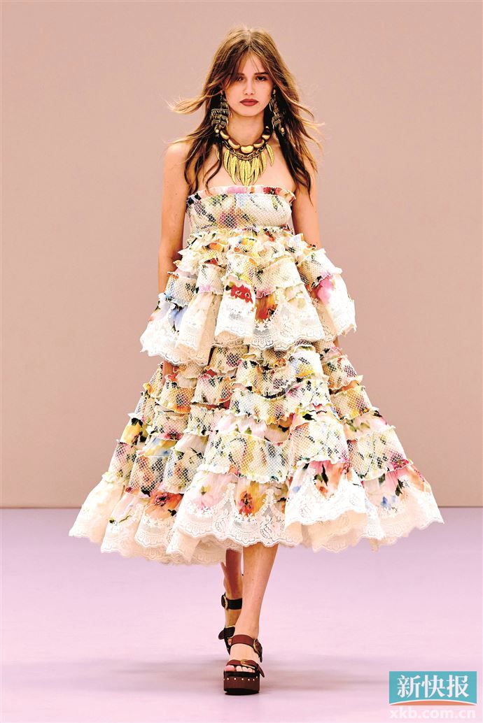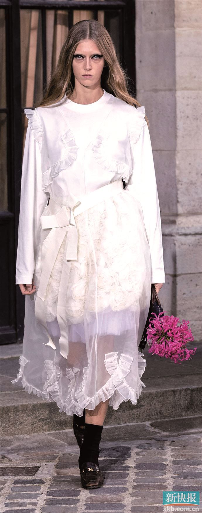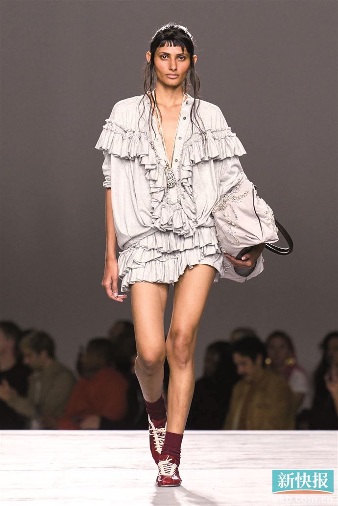 华丽的古典戏剧氛围少不了细节烘托,2026春夏秀场各类花边元素全面霸屏,从密集的领口褶边到裙摆的大面积装饰,从围裙式花边到细节处的零星点缀,将维多利亚风的精致感渗透到每一寸面料。
