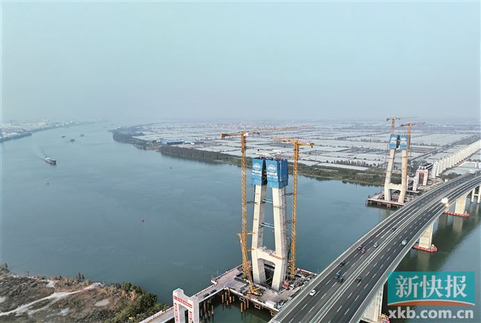 ■日前,深江铁路重难点工程——广中江特大桥跨虎跳门水道斜拉桥17号、18号双主塔施工高度突破百米大关,标志着双主塔进入施工冲刺阶段。铁路建成后,深圳前海自贸片区与广州南沙自贸片区半小时高铁互联互通。 新快报记者 许力夫 通讯员 韦相宇 吴明耀/摄影报道