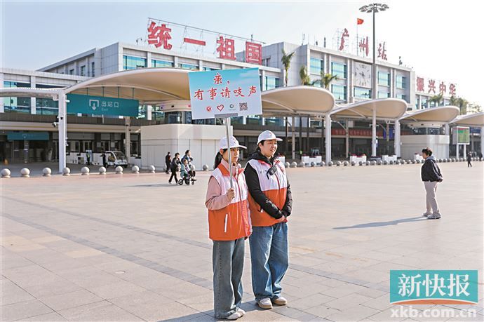 在广州南站,一对老夫妇带着小孙女在三楼候车厅候车,正在读幼儿园的孙女兴奋地和来表演的“大湾鸡”合影。郑先生告诉记者,老家在湖北武汉,他们2017年便来到广州跟随子女生活。