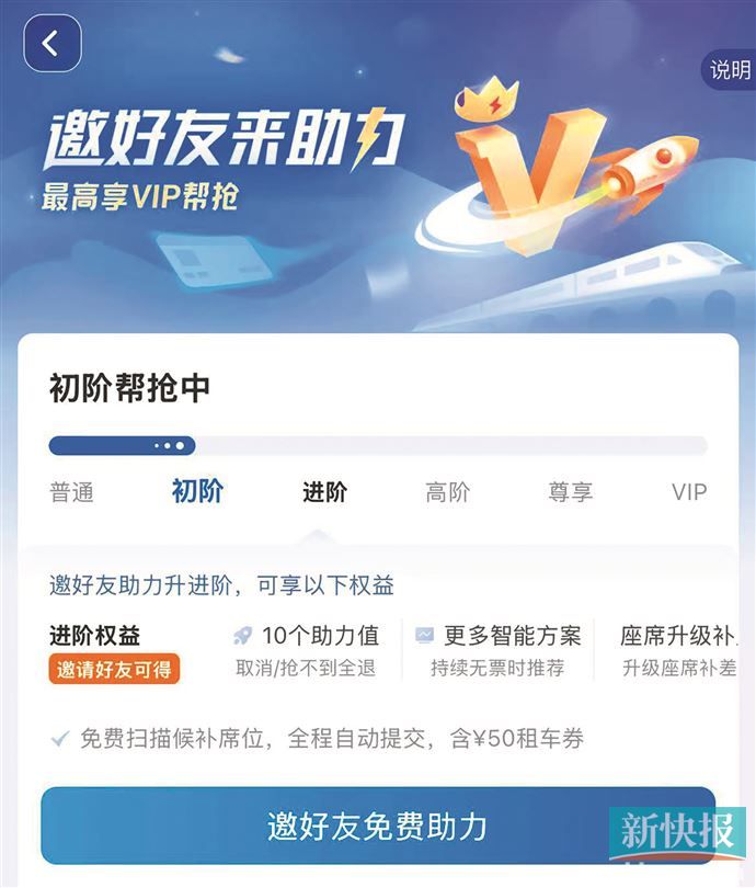 新快报记者发现,一些第三方票务平台推出所谓的“帮抢套餐”,其中就包含“助力包”,使用该权益后可以助力抢票。一些平台还鼓励用户“邀请好友助力”,暗示参与度越高则抢票速度越快。