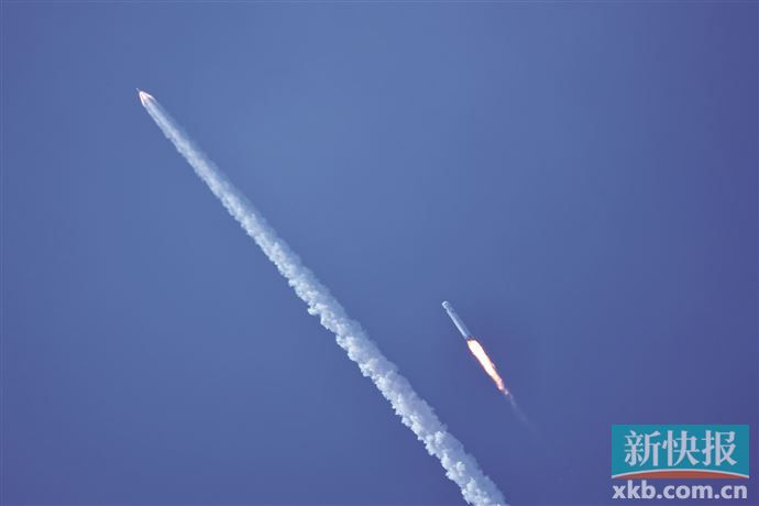 飞行约410秒 一级进入稠密大气层,两台发动机关机,转入气动减速阶段。