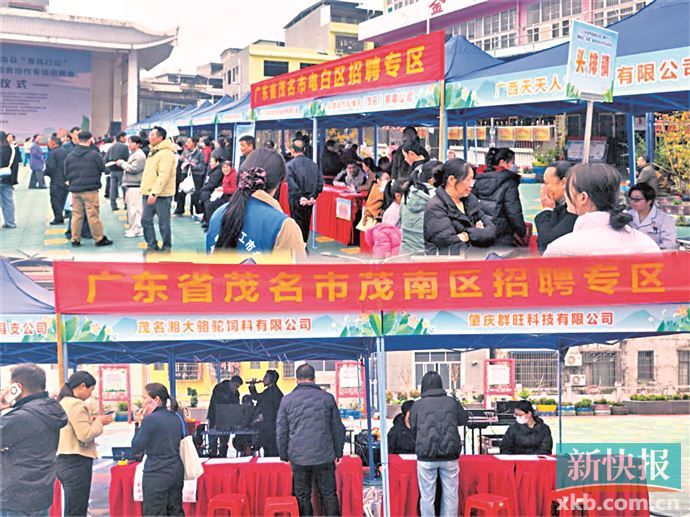与此同时,广东赢创食品科技有限公司、广东问兔科技有限责任公司、茂名景胜环保科技有限公司、茂名北斗星百货有限公司等粤企跨省送岗,带来高薪岗位与先进用工理念,进一步丰富岗位供给层次、拓宽群众就业路径。桂粤两地企业优势互补、资源互通,构建起品类齐全、覆盖面广的就业市场,为求职者搭建起多元选择、双向奔赴的就业桥梁。