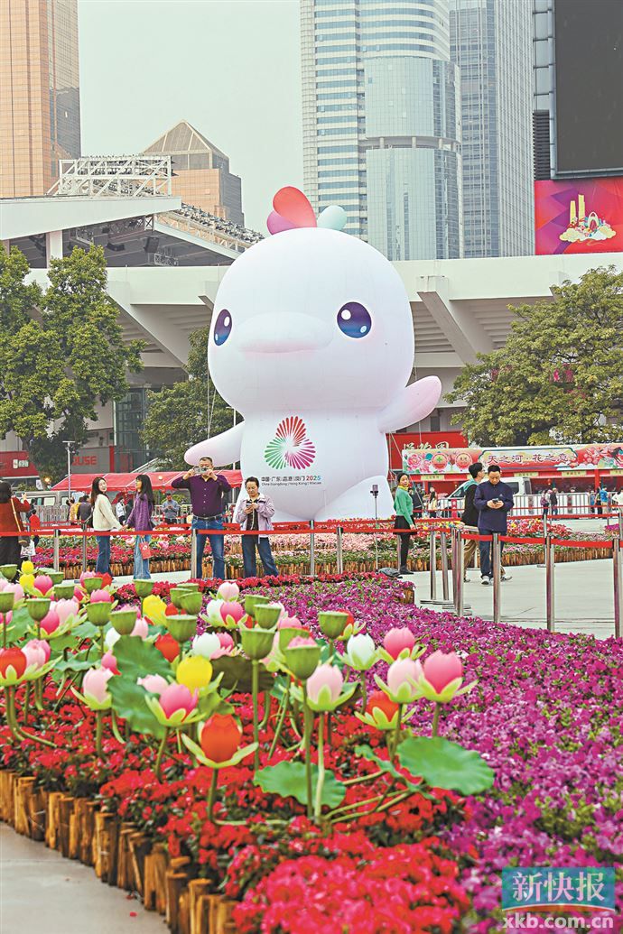 花市中还深度融合了十五运会与残特奥会元素,南广场的巨型“大湾鸡”充气造型,与牌楼光影、中心花境交相辉映,带领市民重温全运激情。2月13日下午进行的启幕仪式上,“大湾鸡”充气人偶的惊艳亮相也同样引发市民的关注,大家争相互动、合影留念。