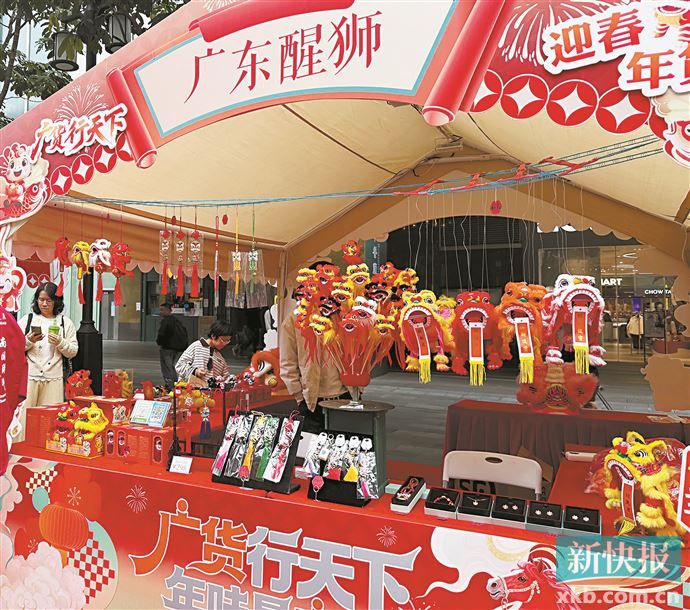 春节前夕,2月4日至10日连续七天,北京路更举行了“广货行天下”2026年北京路花灯年货节。在赵家狮非遗生活馆摊位前,各式各样的醒狮文创让人目不暇接。店长林师傅告诉记者,作为广东省非遗项目的广东醒狮,过去以大型狮头表演为主,如今被匠心巧手做成缩小版文创:挂件、摆件、项链、手链、耳钉,品类多达两百余款,其中二十余款拥有自主版权。