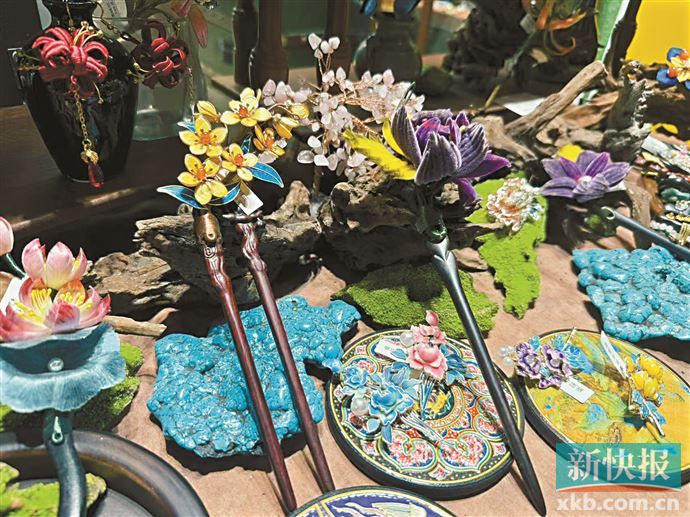 特别想推荐的是街巷里的“隐秘市集”。北京路南段圣贤里、书院街内化身“风物大集”,北京路管委会引入了植物手作、押花、缠花、绒花、景泰蓝等非遗工艺品小摊,形成一幅民艺业态,五光十色的工艺品价格从十几元到上百元不等。爱好汉服的江西游客清清走进越秀书院街的点翠发簪小摊,眼睛就挪不动了:“国风发簪配色、纹样都超级精致,搭配汉服和日常穿戴都适合。”