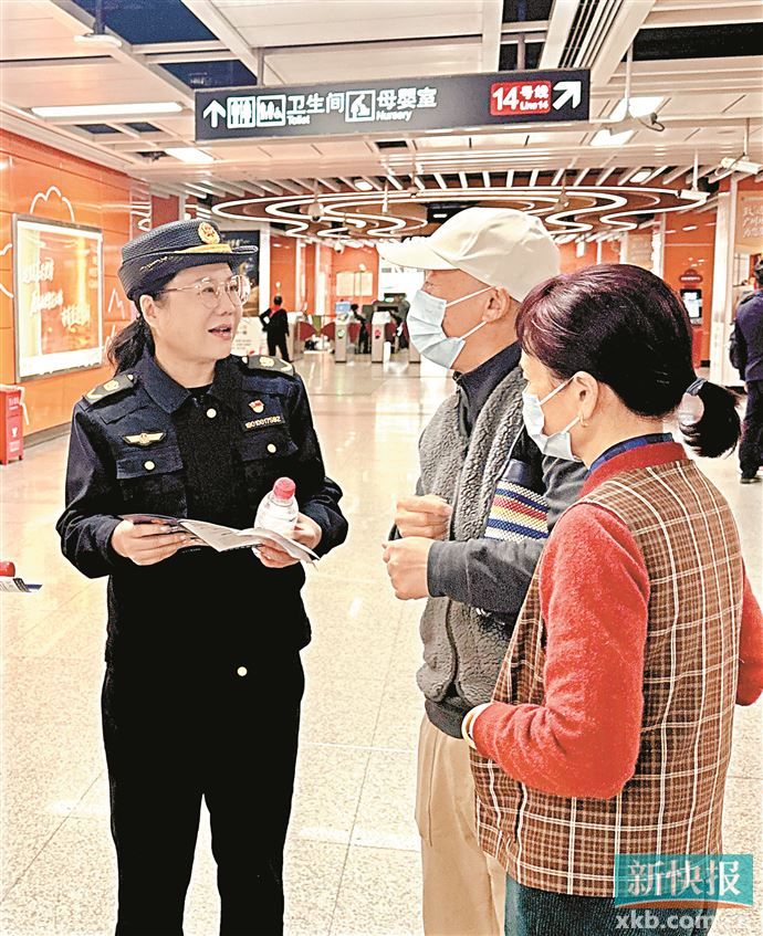 客流高峰里,黄茜是暖心服务者。在熙攘的站厅,她联合广州地铁集团开展地铁保护普法宣传,向过往旅客发放手册、讲解设施保护知识,同步提供路线指引、答疑解惑等便民服务。“您好,请了解一下地铁保护知识,祝您旅途平安。”一句句温暖问候,让执法更有温度。站内“愿您此去繁华似锦,亦有重逢可期”的标语,正是她与同事坚守的生动注脚,让法治宣传与暖心服务相融,传递春运归途的温情。