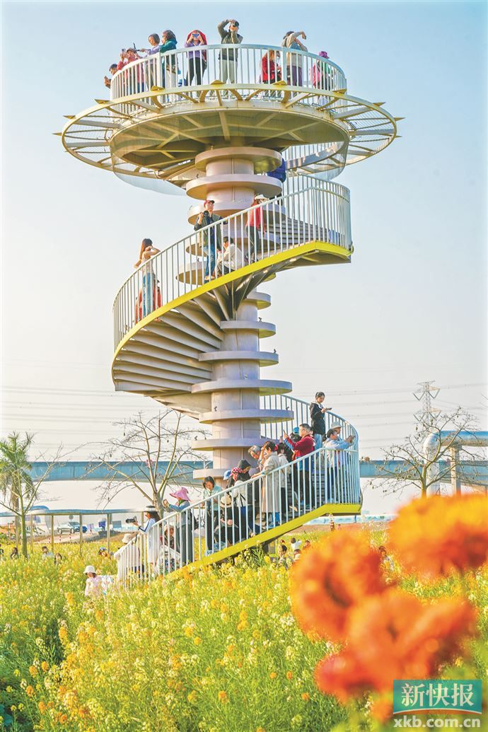 官坦农业公园便是东涌镇融合激活年味经济的典型范例。曾经,这里是一片闲置土地,与周边交通衔接较差。为助力“百千万工程”取得实效,促进城乡土地资源高效集约配置,东涌镇联合有关部门通过全域土地综合整治将零碎地块统筹起来,荒废农用地四季轮作观花类作物,规整永久基本农田种植粮食类作物,再结合栈桥、步道系统等组成游览网络等措施,将农业公园打造成农业科技、田园文化、湿地风光三合一的体验区。同时,保持乡土景观本底,建设成为丰富变化的都市田园,创造农旅融合的游憩体验。该项目通过耕地集中整治达成农业增产,通过吸引游客创造商机达成村民增收,通过修复河岸湿地形成五彩油菜花与高楼林立的大学园区交相映衬的优美画面,充分展现了南沙全域土地综合整治工作的成效,粮食安全、村民增收、生态修复“三赢”的局面逐步形成。如今,橘红色、粉白色、嫩黄色……南沙东涌官坦农业公园里约139亩梦幻般的七彩油菜花海,在大地上描画出油画般的美景。