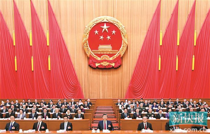 人民大会堂万人大礼堂气氛庄重热烈,主席台帷幕正中的国徽在鲜艳的红旗映衬下熠熠生辉。
