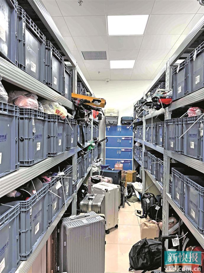 作为全国客流量最多的高铁站,广州南站每天的出发和到达的旅客都数以十万计。他们中不乏在匆忙大意中遗忘随身物品的乘客,在广州南站,这样丢失物品的情节每天都在上演。新快报记者近日走进位于广州南站东南门综合服务中心的遗失物品招领处,各种遗失物品堆满了数十平方米的存放处,不仅多个长长的置物架都塞得满满当当,每个角落也都堆满了遗失的物品。工作人员打趣:“最多时房间都放不下,刚刚清理了一批,要不然房间连个走路的地方都没有。”