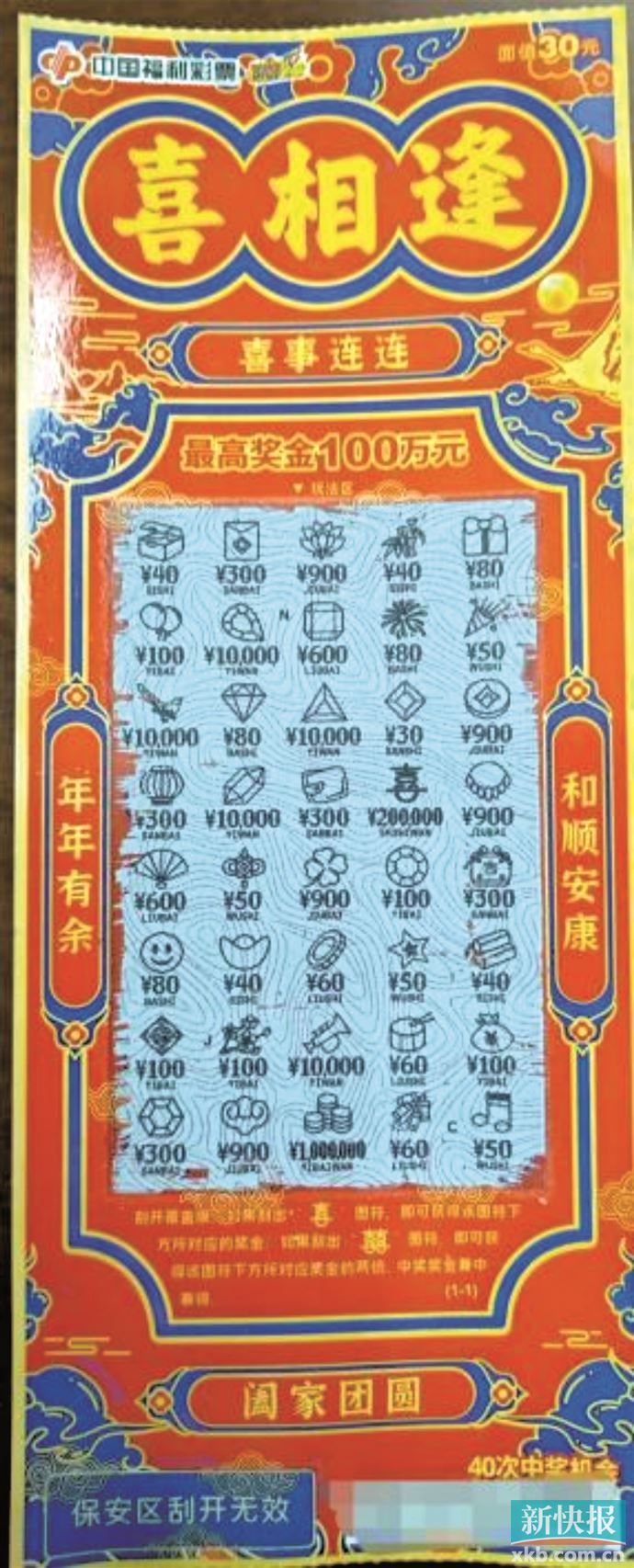 “喜相逢”作为福彩刮刮乐即开票的经典款,以其喜庆吉祥的票面设计、简单有趣的玩法,深受广大彩民喜爱。“喜相逢”玩法简单,即开即兑。刮开覆盖膜,如果刮出“喜”图符,即可获得该图符下方所对应的奖金;如果刮出“囍”图符,即可获得该图符下方所对应奖金的两倍。中奖奖金兼中兼得。“喜”与“囍”的中奖图符设计,再次呼应“喜相逢”主题,传递相逢甚喜、喜事成双的美好寓意。