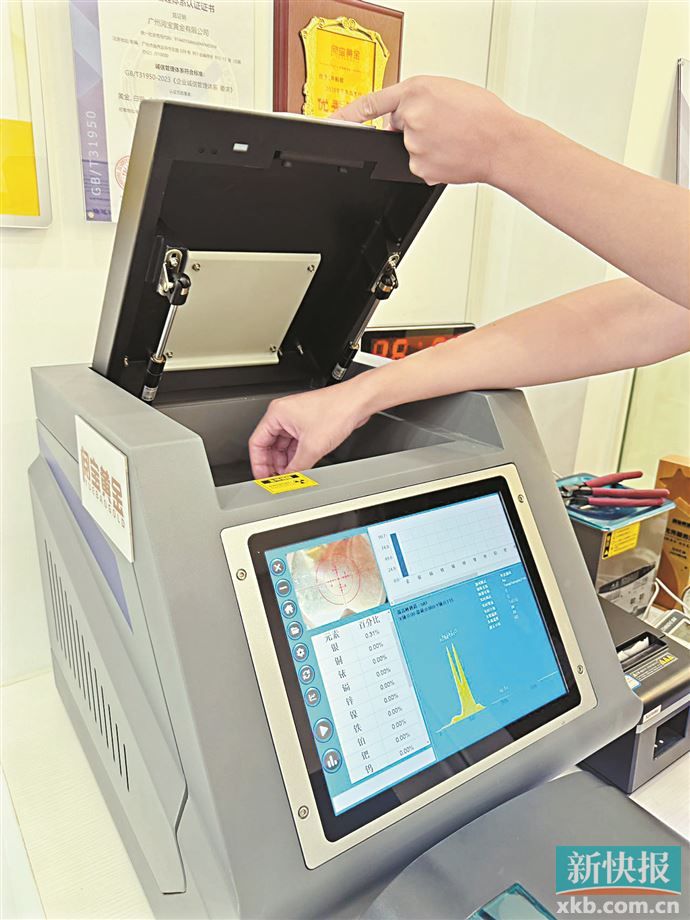 王伟彬介绍说,正规的黄金回收流程为“一看二剪三熔四测”,具体包括客户实名登记、签订回收协议、使用检定合格的电子秤称重(现场用砝码校准)、光谱仪检测成色、破坏性检测(剪开、熔金)验证内部是否掺假、双方确认价格、对公账户付款等步骤。其中称重、光谱检测、剪开和熔金操作、价格确认等关键步骤,必须在顾客的见证下进行,确保全程透明、可追溯。