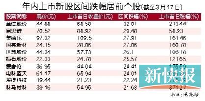 新快报讯 记者涂波报道 截至3月17日,年内A股已上市新股21只,科创与专精特新企业占比超七成。总体来看,今年新股上市首日实现零破发,个股平均涨幅约190%。值得关注的是,今年的新股上市后走势分化明显,最新收盘数据显示,除觅睿科技、固德电材和陕西旅游三只新股现价高于上市首日收盘价,其余18只个股均呈“上市即巅峰”的下跌走势。