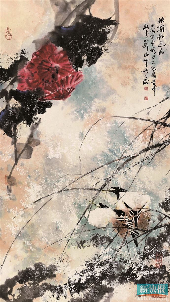 韩天衡:我之所以那么喜欢画荷花,因为古人谈到用花来表现文人的气质,往往都是讲“梅花香自苦寒来”,越是天寒地冻,它越是开得茂盛,越是满园芳香,但是我感到很奇怪,为什么那么多文人都不歌颂荷花的刚劲呢。在七月天,很多花都相对凋敝的时候,只有荷花开得那么的强烈。所以,它就给我一个感受,在那么强烈的阳光下,人都不敢在马路上,它却开得那么的灿烂,它拥有光明的性格,我们要及时地表现和歌颂它,所以我认为,荷不畏暑,与梅同格。