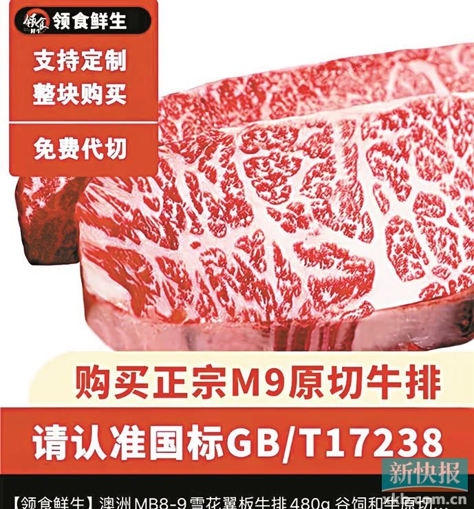 另有一些商家对国标进行了“挪用”。记者注意到,在某电商平台,有卖和牛的商家在宣传图中标注“购买正宗M9原切牛排,请认准国标GB/T 17238”。记者查阅后发现,GB/T 17238是中国用于规范牛肉屠宰加工和流通环节的国家标准,全名为《鲜、冻分割牛肉》,目前最新标准为GB/T 17238-2022。其中不仅未对“M9”这样的商业评级作出任何规定,而且在2022年修订版中更是直接删除了质量分级相关内容。商家若将该基础性加工标准包装成高端牛肉的“品质认证”,恐有对消费者造成误导之嫌。