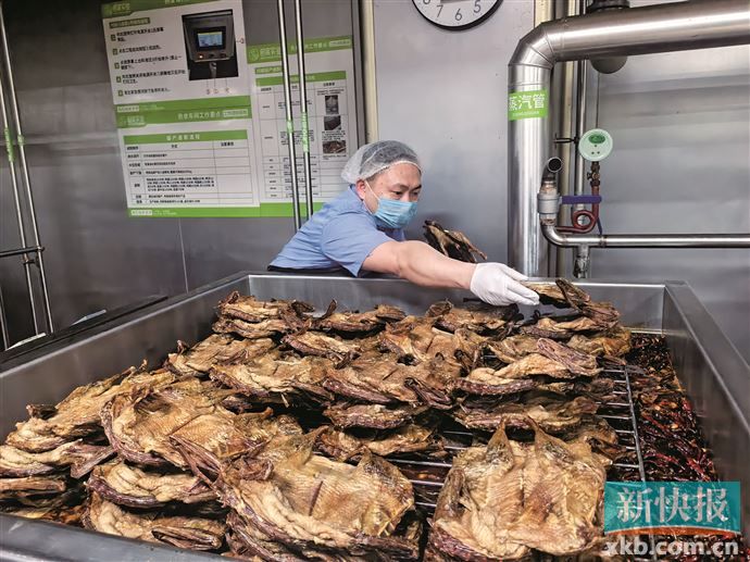 当天21时,紧邻的熟食车间香气弥漫,腌制、卤制、冷却、分拣、包装等工序有序推进。“我们熟食车间严格按照食品加工规定管理,配备自动化生产线,基本能满足全国一线门店日常需求。”熟食车间主管詹鸿强一边巡查生产线一边说。经多道秘制工序卤制的酱板鸭经严格分拣和包装后,迅速搭乘冷链物流车发往全国600余家线下门店。