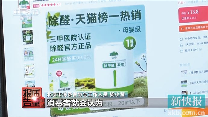 北京市消费者协会工作人员杨小莹表示,一款宣称在24小时除醛率达到99.9%,在宣传页面上会显示,净化面积是20平方米以下,同时还有一罐装的标识,消费者就会认为,一罐的凝胶就可以净化20平方米以下的环境。