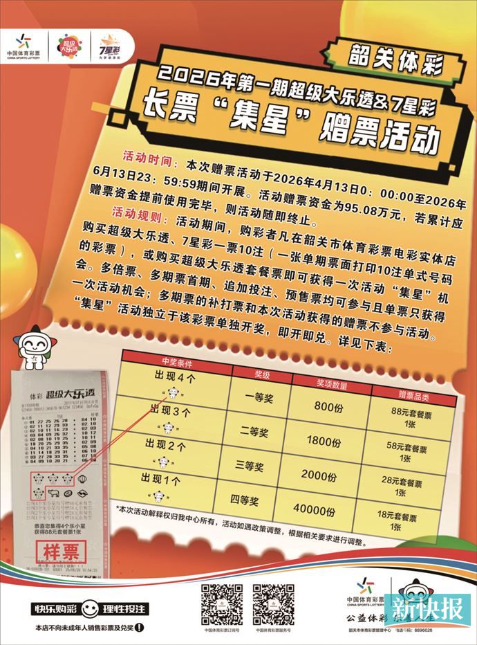 新快报讯 记者陆妍思 通讯员韶关体彩报道 为回馈广大购彩者,4月13日起,韶关体彩推出超级大乐透&7星彩长票“集星”95万元赠票活动。