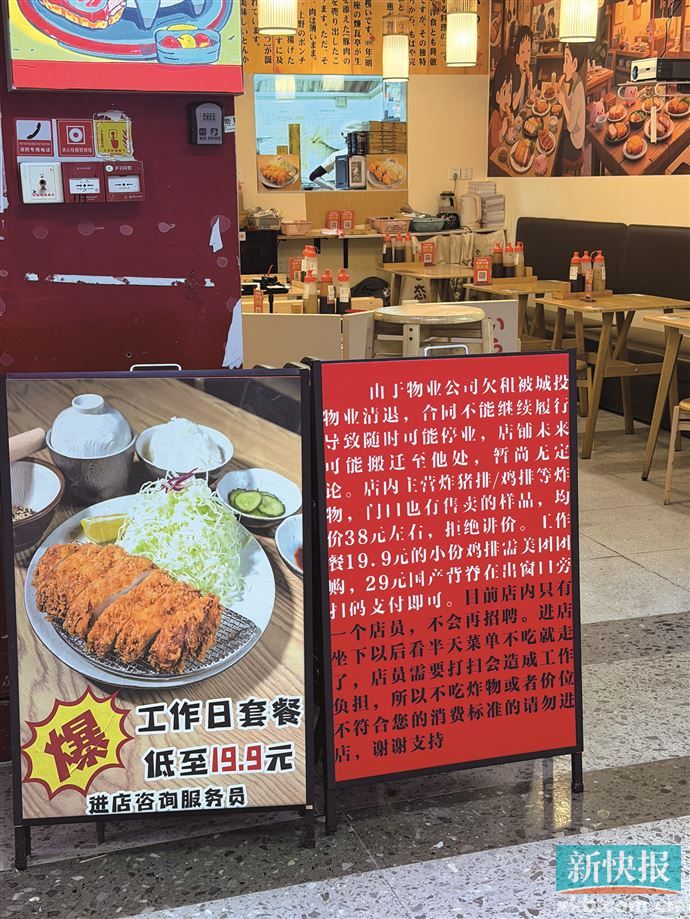 往日作为珠江新城打工人“饭堂”的花城汇,近日明显异常冷清。新快报记者在现场看到,花城汇北区多家商铺大门紧闭,部分仍开业的商铺门口张贴着“因物业公司欠租被城投物业清退,合同不能继续履行导致随时可能停业”“因花城汇改造,物业不让本店继续营业”等告示牌,北区负一层只有10多家餐饮店仍在营业状态。