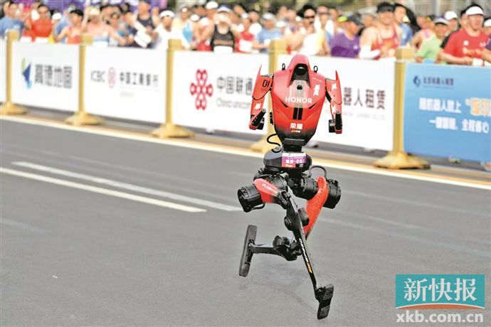 当天上午7时30分,发令枪响。与1.2万余名人类跑者一同冲出起跑线的,是身披红色战衣、采用潮酷机甲风设计的荣耀机器人“闪电”。