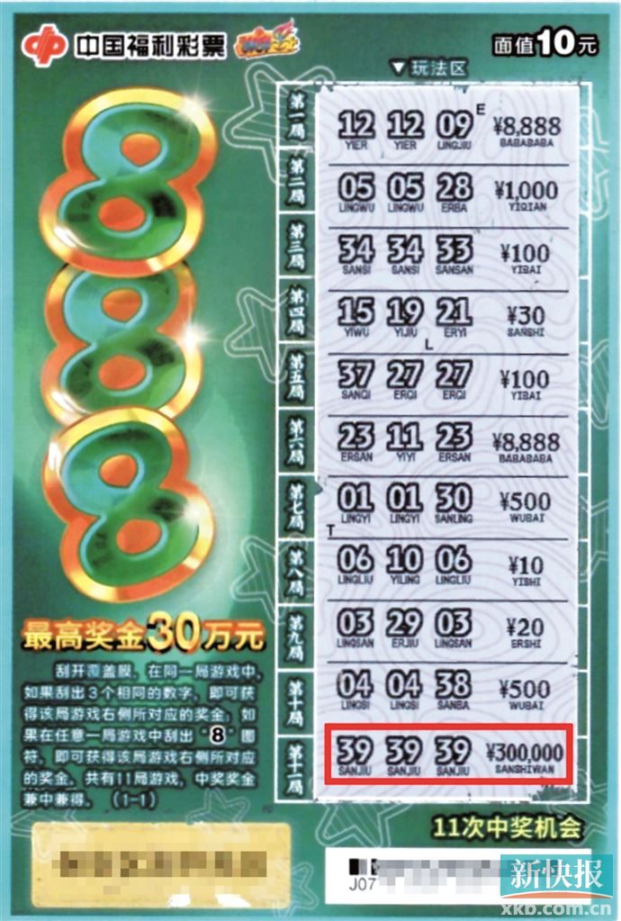 李先生分享了自己的中奖经过:中奖当晚,他下班路过44120155福彩销售站点,进店时看到展示柜有一张“888”刮刮乐即开票的尾票,便买了下来开刮。在刮开彩票的玩法区后,出现三个相同的号码“39”,对应的奖金是30万元。