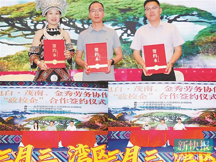 在粤桂跨区劳务服务环节,现场举行“政、校、企”三方就业帮扶签约仪式,持续打响擦亮“金秀瑶医药康养师”劳务品牌。金秀瑶族自治县人力资源和社会保障局、广东茂名健康职业学院、广东黄秀梅健康产业有限公司、瑶山源养生堂有限公司共同签订合作意向书,构建政府搭台、院校育人、企业用人的协同发展格局。
